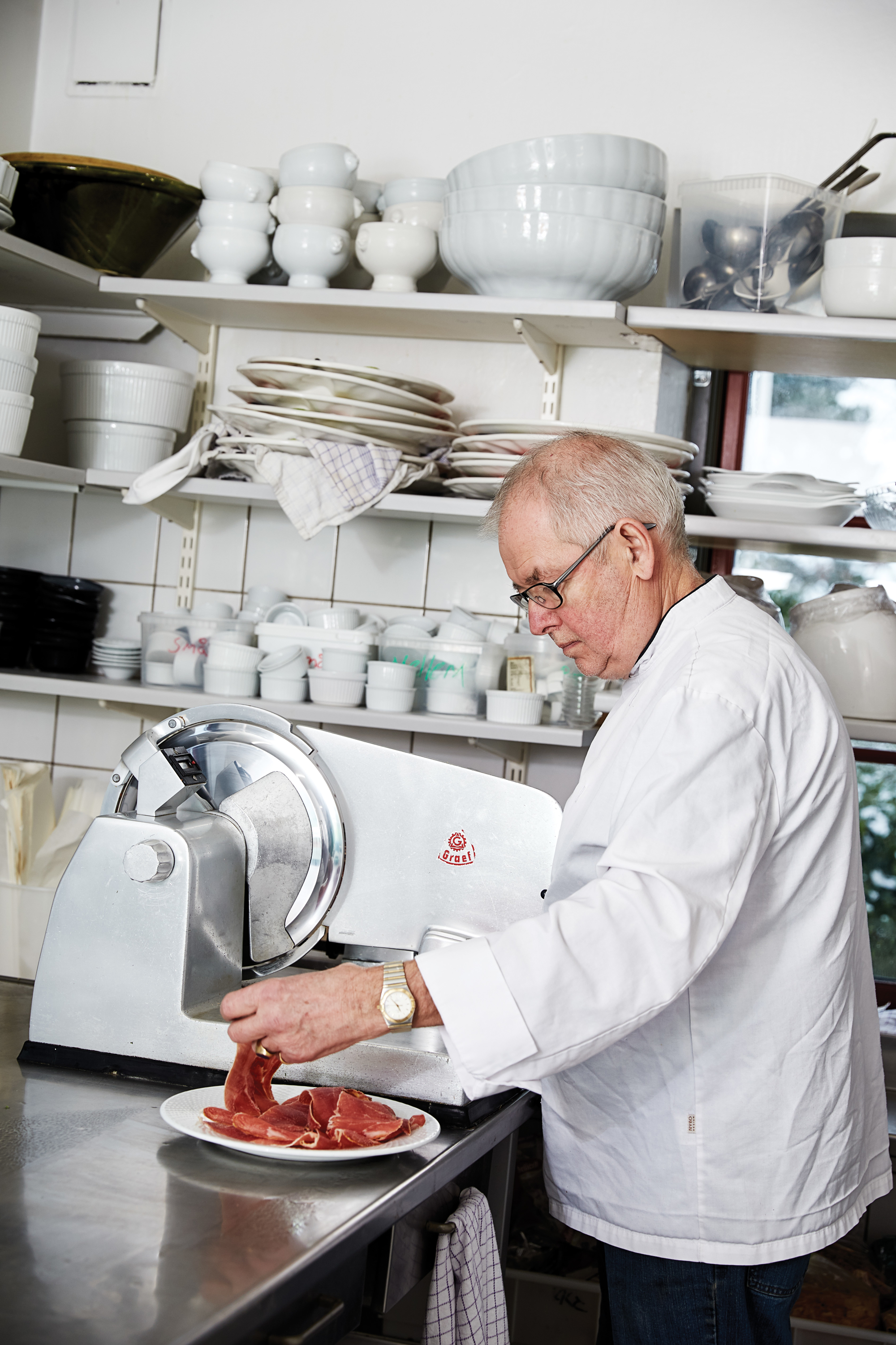 Den nye RATIONAL-ovn har betydet store forandringer i det lille krokøkken, erkender Christian Andersen. "Jeg havde ellers vænnet mig til den gamle 60'er ovn med to ovnlåger med plads til ét stik i hver. Jeg havde også vænnet sig til, at det tog en time at varme ovnen op, og derfor lod vi den være tændt hele dagen. Jeg havde såmænd også vænnet mig til elregningen."