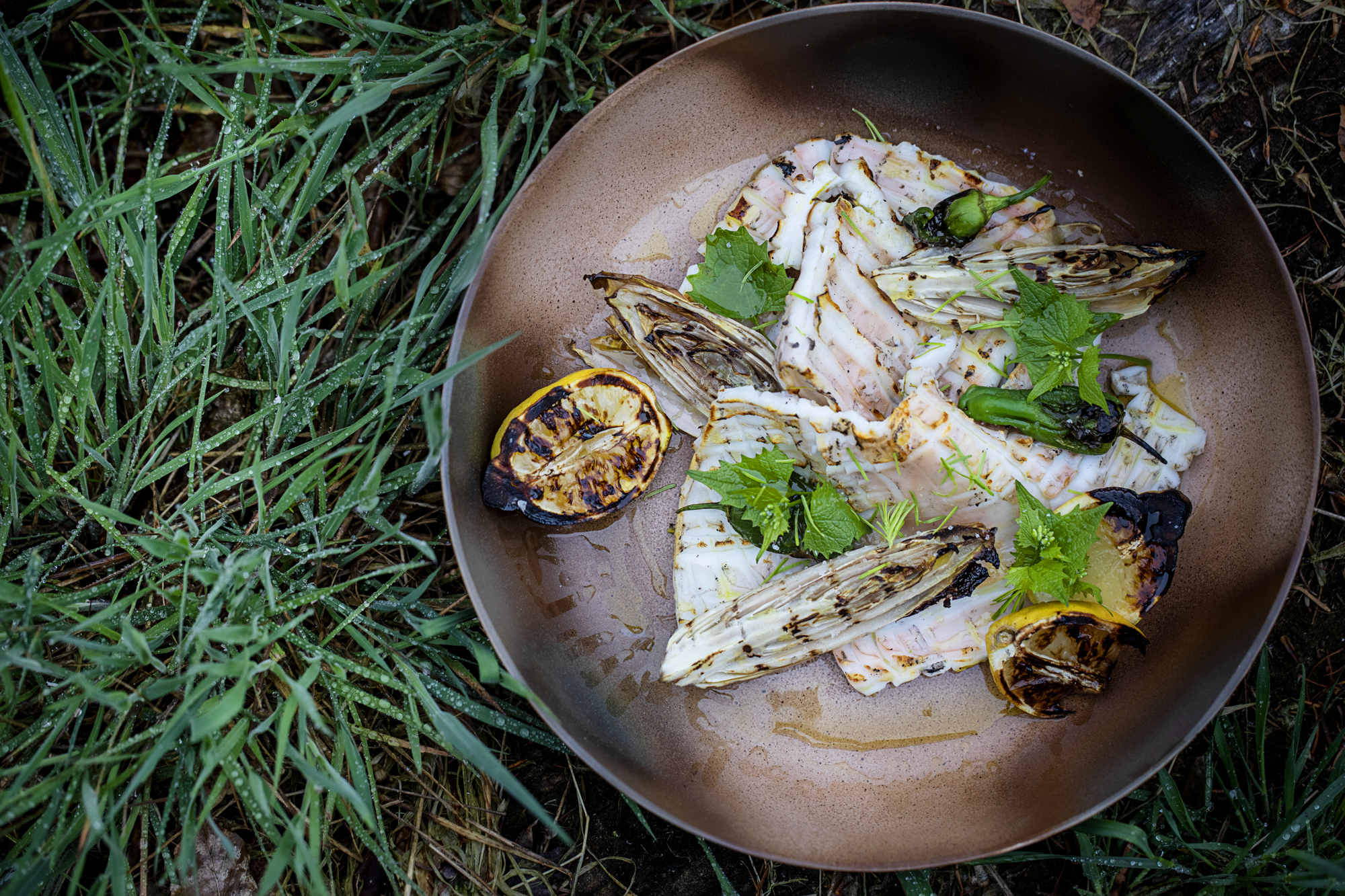 I det høje bål-bed placeres et udbenet lammebryst, der kunstfærdigt spændes ud på 3 metalstænger, så det over et par timer grilles perfekt af strålevarmen fra bålet, før det serveres med flækkede, grillede hvide asparges. På bålpladsens indbyggede grillrist varmes der godt op med egetræ, så den opskårne blæksprutte ikke kun koger, men bliver delikat grillet. Dennis har forsigtigt ridset blæksprutten på kryds og tværs og krydret med friske granskud. Tilbehøret er grillede citroner og julesalat. Og for at få det sidste af aspargessæsonen med, grilles grønne asparges, der får selskab af mandler og revet parmesan. Desserten er grillede rabarber serveret med græsk yoghurt og flydende honning.