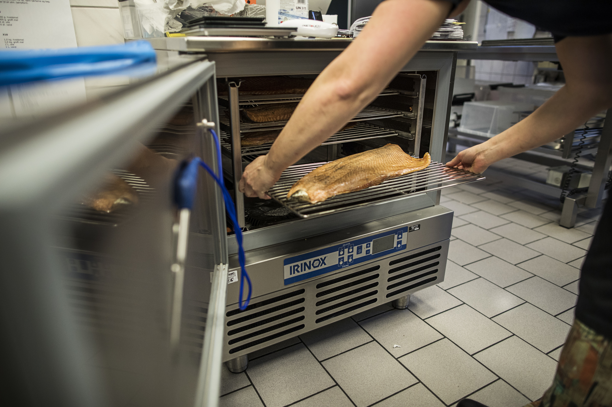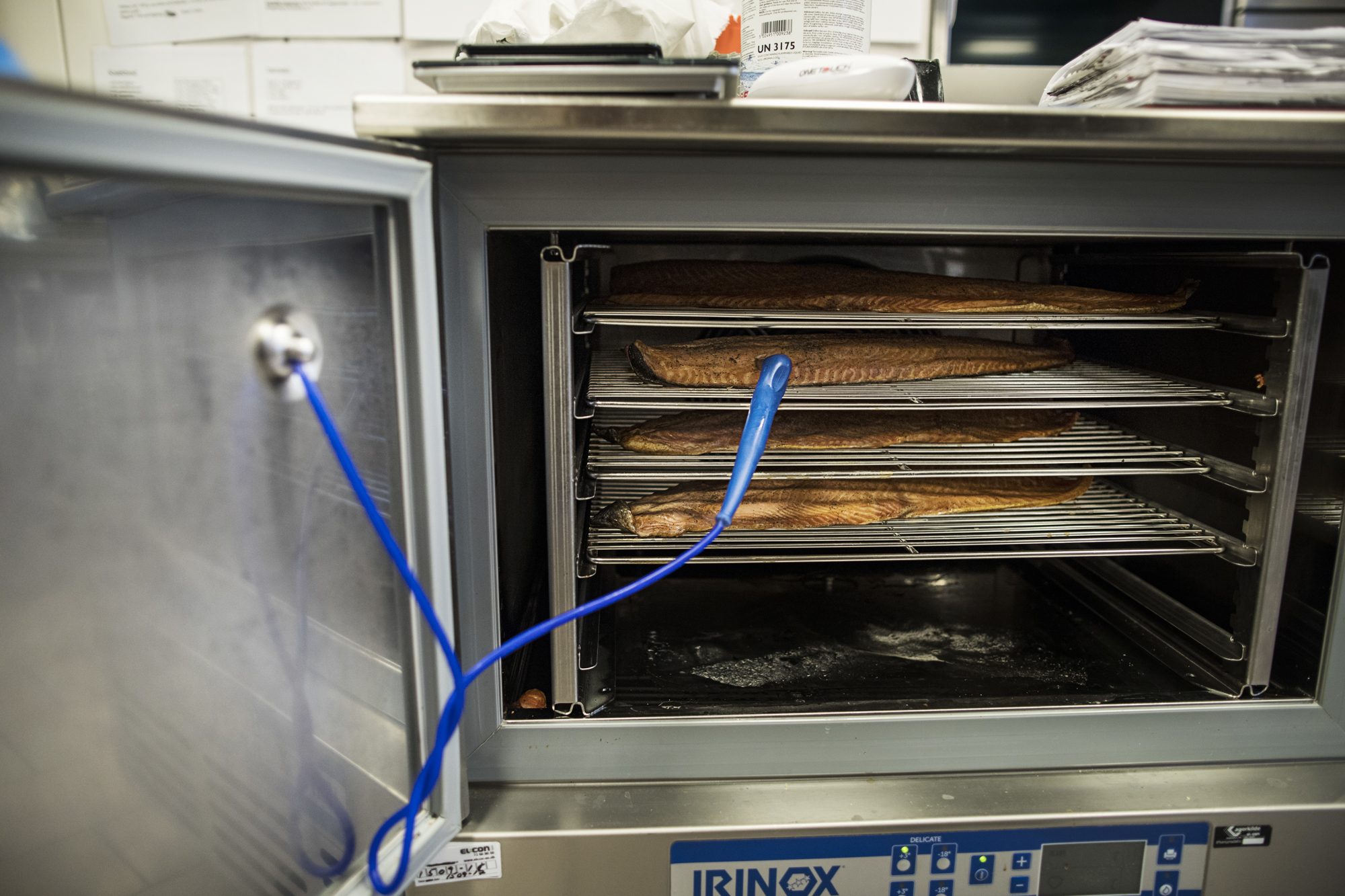 Det er ikke kun laks, der ryges i RATIONAL-ovnene, men også rejer, muslinger, hjemmelavet pastrami og kyllinger. Kyllingerne placeres opretstående på de specielle spyd, som sikrer, at kyllingen tilberedes hele vejen rundt på kort tid. Lars har også investeret i tilsvarende spyd til skinker, der får sprødt svær hele vejen rundt, som han siger. Næste indkøb er måske stativer, så der kan steges hele dyr i ovnen.