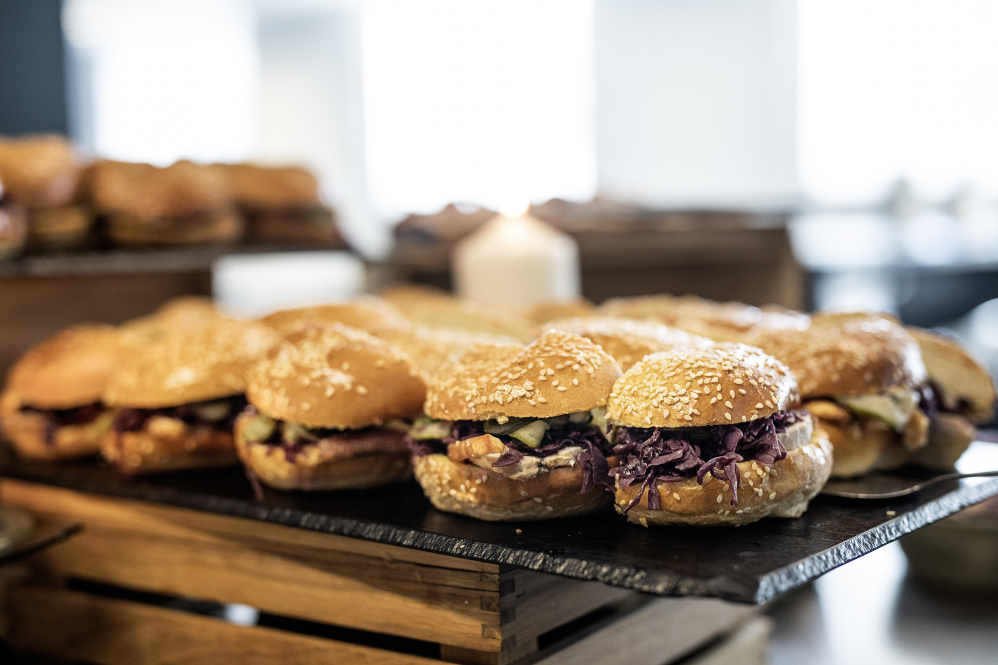Den faste disk er suppleret af 2 mobile enheder, hvor salatbaren og det kolde anrettes – ofte også som portionsanretninger – og en disk med stenbordplade, hvor der kan eksperimenteres, og hvor også husets lækre brød placeres. En rustik, hyggelig præsentation med trækasser og skiferplader, som passer godt til stemningen i kælderen.