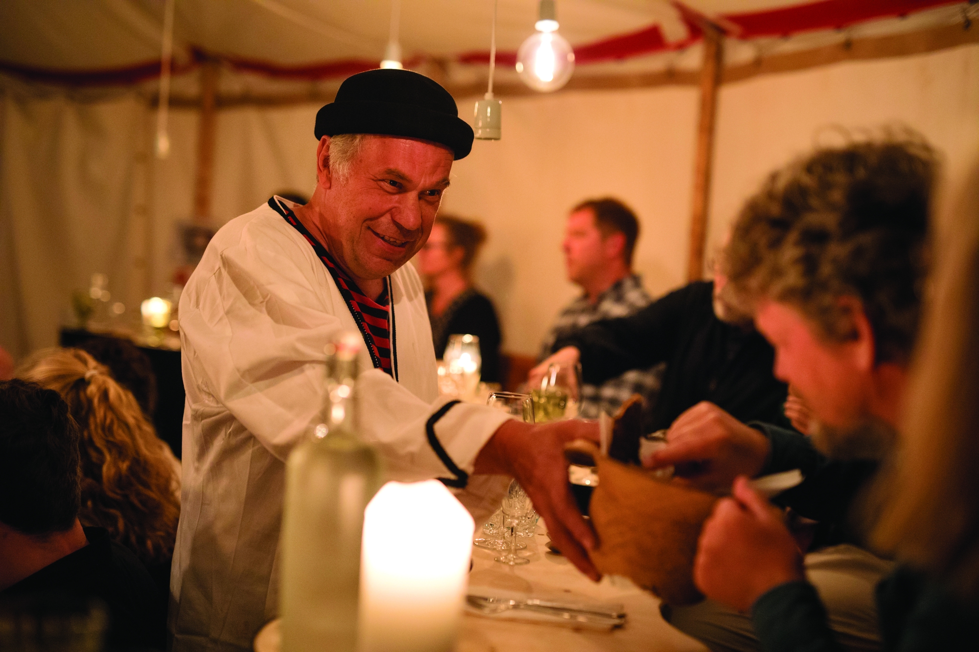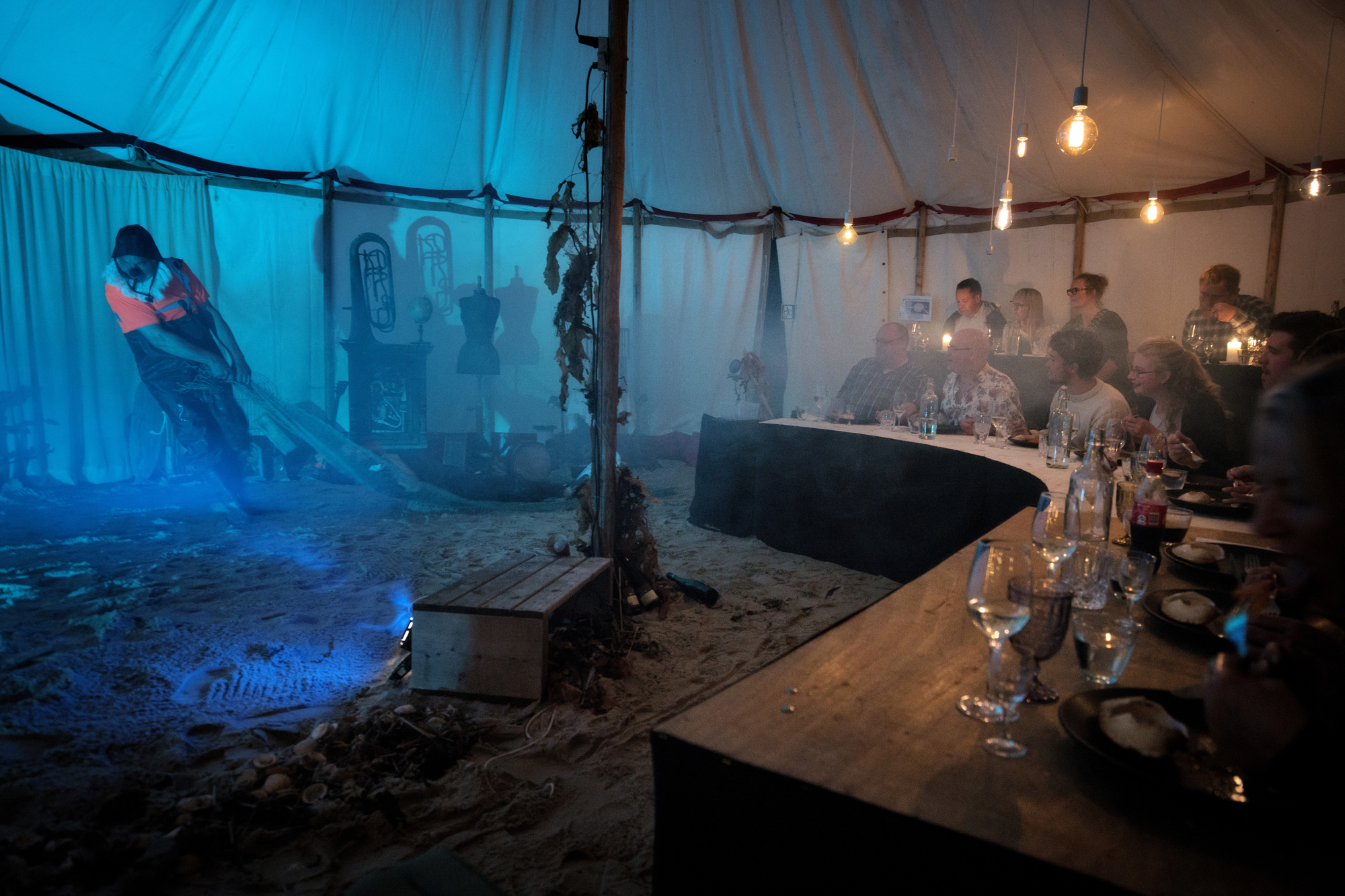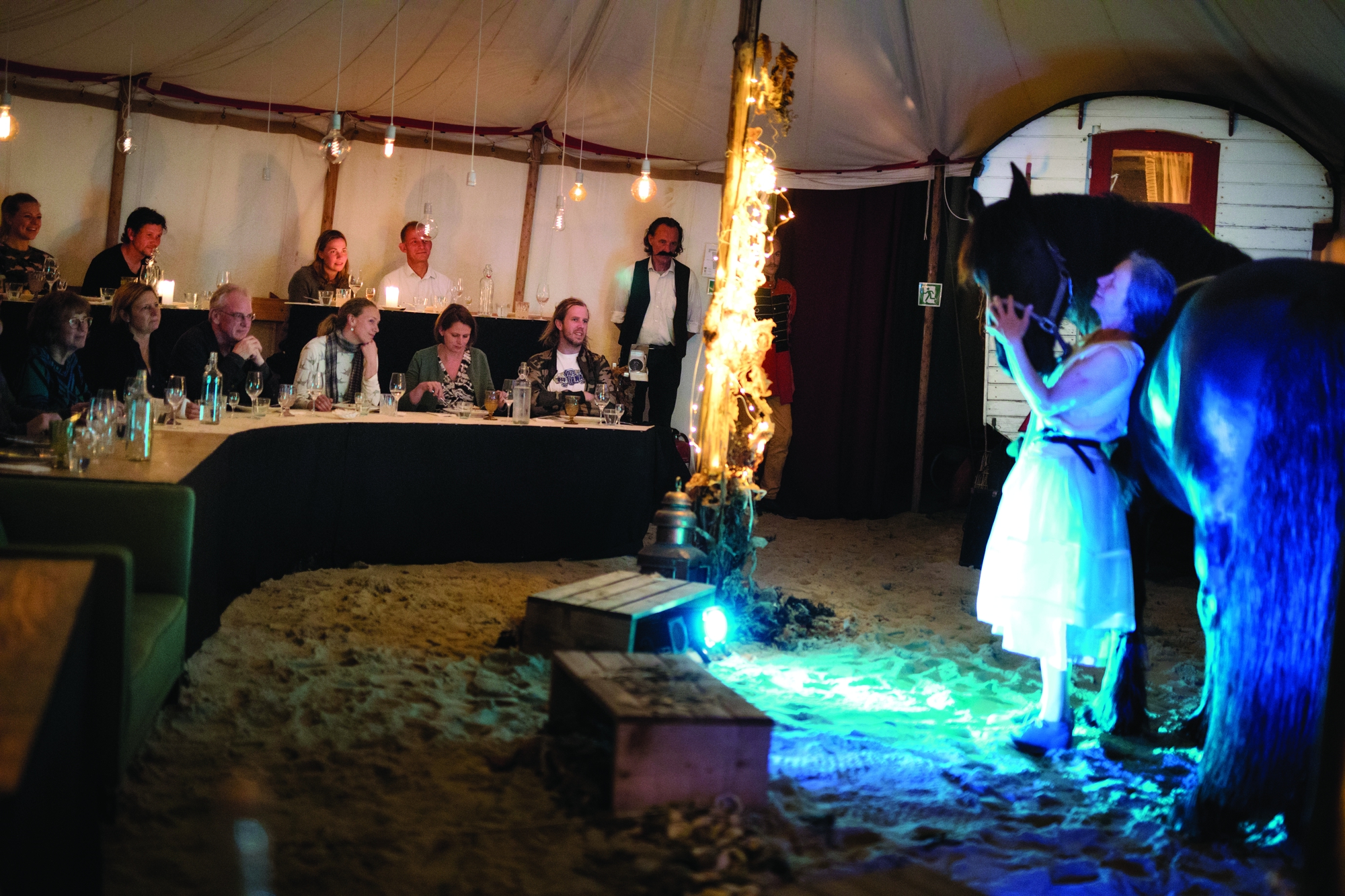 Det lille cirkustelt er fra 1900-tallet. Teltet er denne aften rejst i et studie på Den Europæiske Filmhøjskole i Ebeltoft, hvor 42 publikummer – eller gæster – er placeret ved fint opdækkede borde, der slynger sig langs kanten af manegen med ti tons sand. Sammen med den gamle cirkusvogn, mystiske rekvisitter og lyset fra glødepærer giver det en helt særlig stemning, som ikke bliver mindre speciel, når show og servering går i gang. Når gamle gøglere, cirkusmusikanter, klovne og cirkusprinsessen med sin hest kaster sig ud i fortællinger, artisterier og serveringer, der på en gang går op i en højere enhed. Bl.a med lys projekteret på teltdugen og 7 retter uden menukort, ypperligt tilberedt og anrettet.