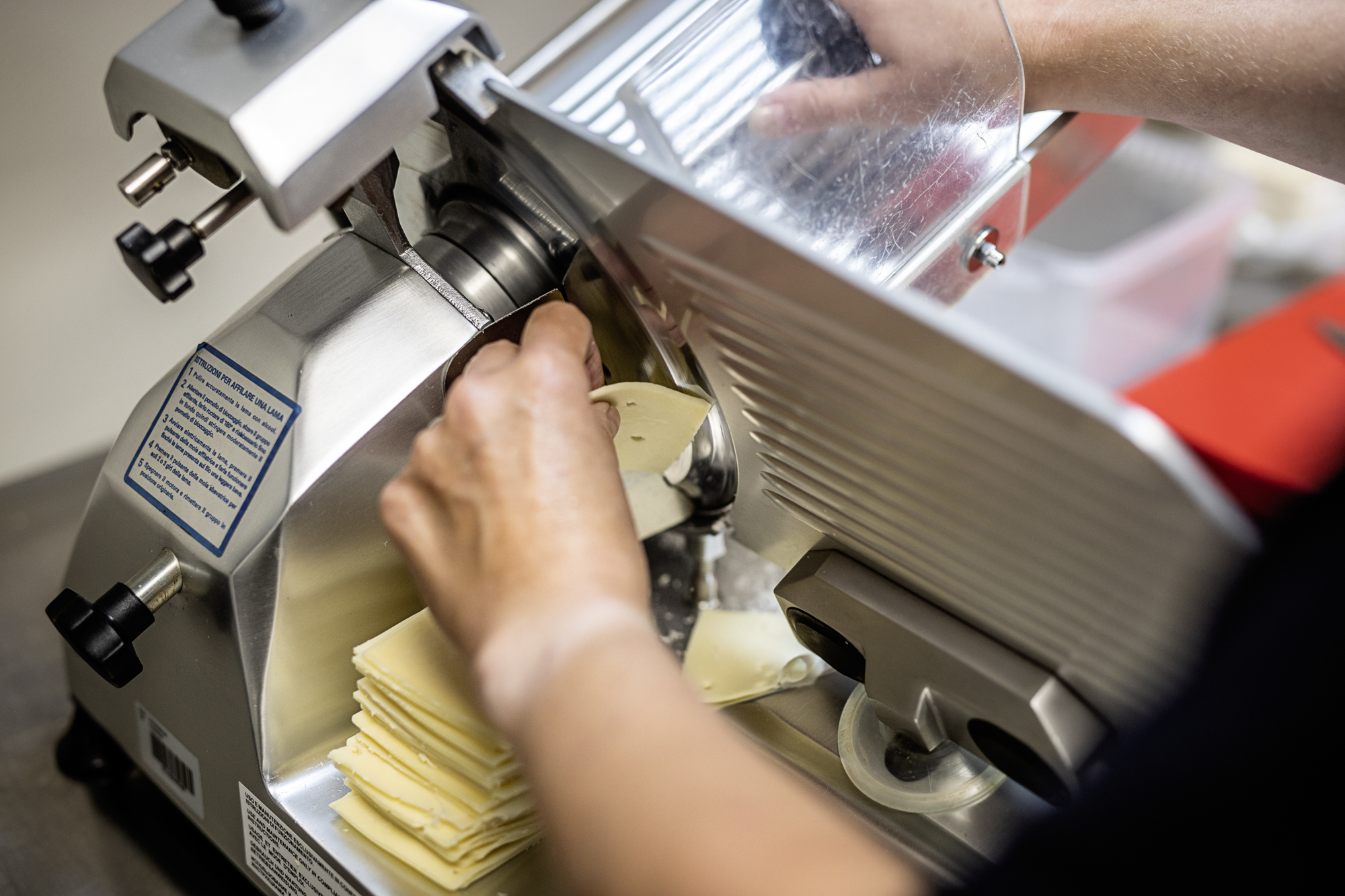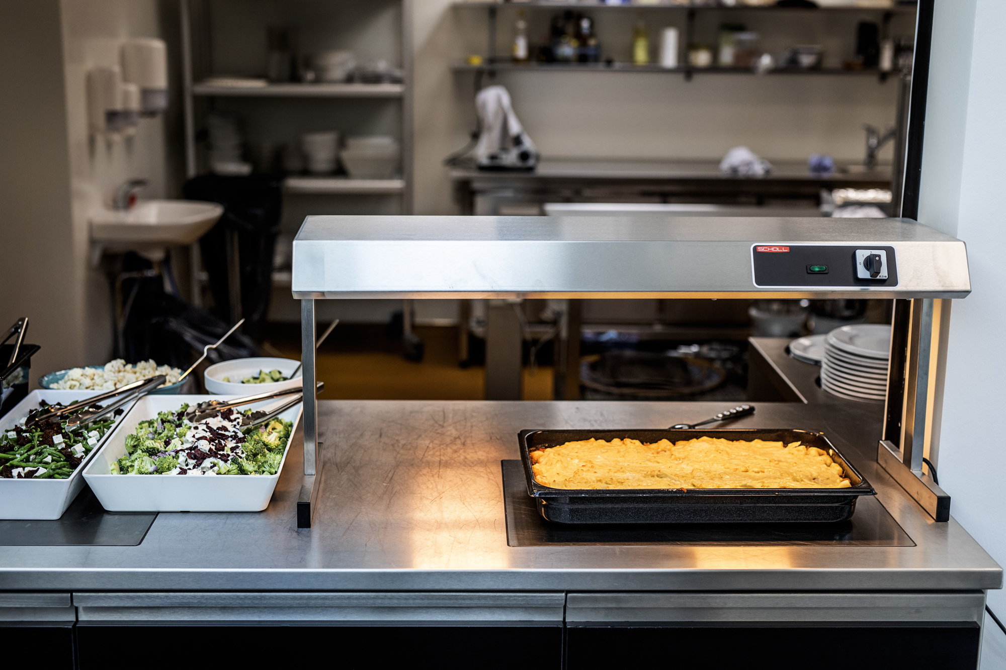 En åbning i muren mellem kantine og køkken tjener som plads for salatbar og varmholdning. Men myndighederne stiller krav til en sådan åbning. Et metaljalousi og et brandsikkert gardin ruller automatisk ned, hvis sensorerne registrerer brand.