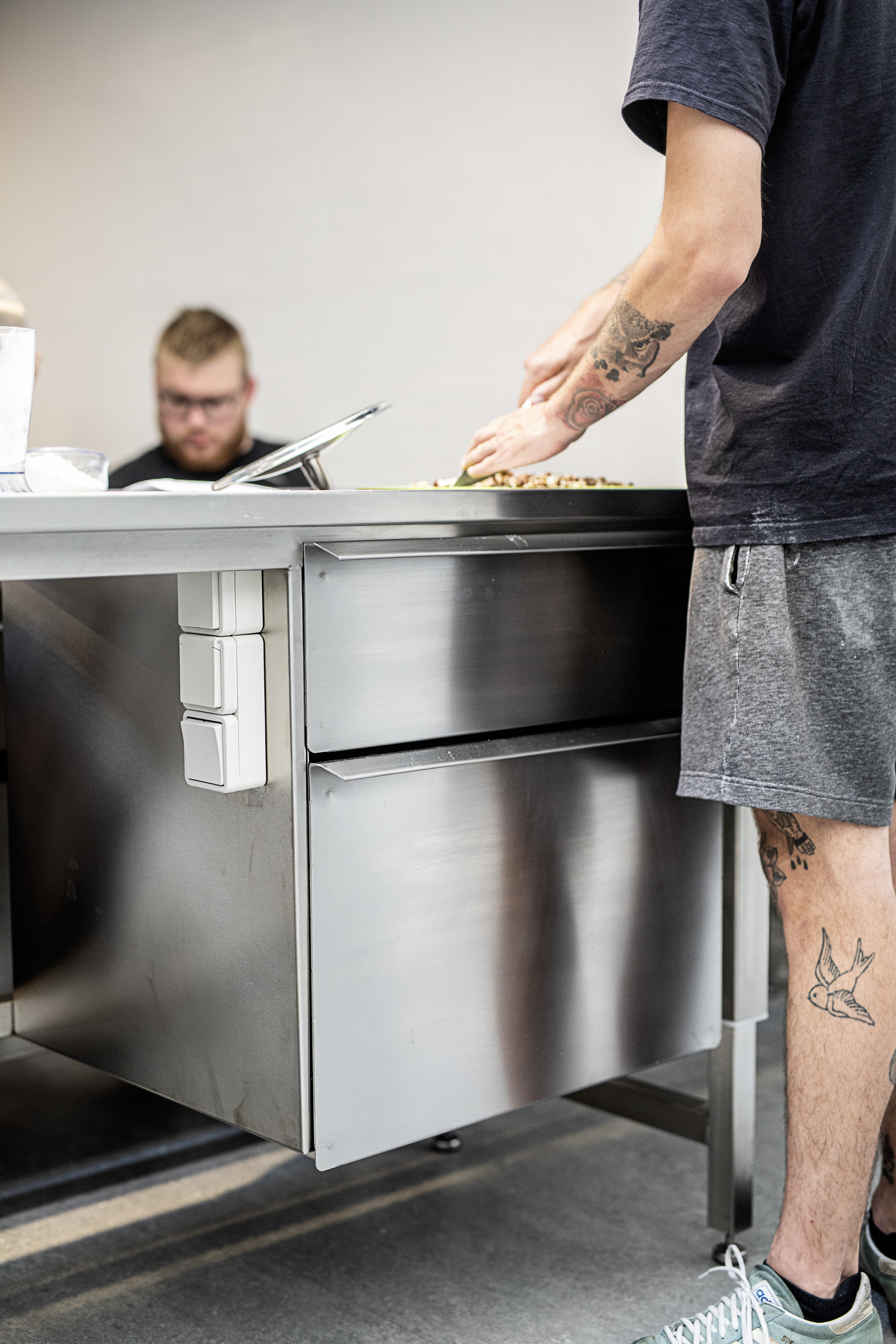Mens Maria forklarer, tager dagens opgave – en dessertburger – form i et effektivt samarbejde, hvor alle bidrager med det, man kan. ”Det er ikke et fag med et pensum, så vi kan lave det, vi synes er fedt,” lyder det med faglig begejstring og med en baggrund i et speciale i Human Ernæring. Samme baggrund har Marias kollega, Jannie, mens køkkenets tredje lærer, Michael, er kok.