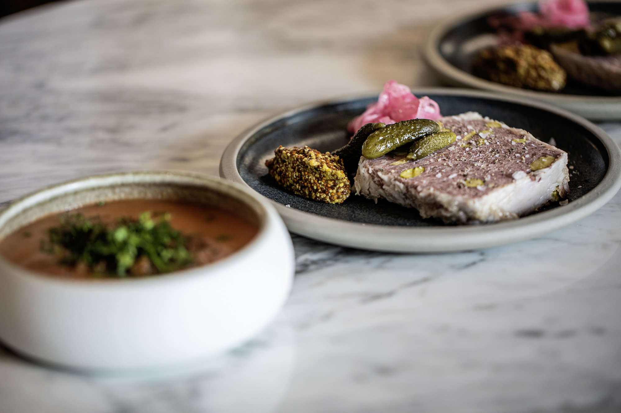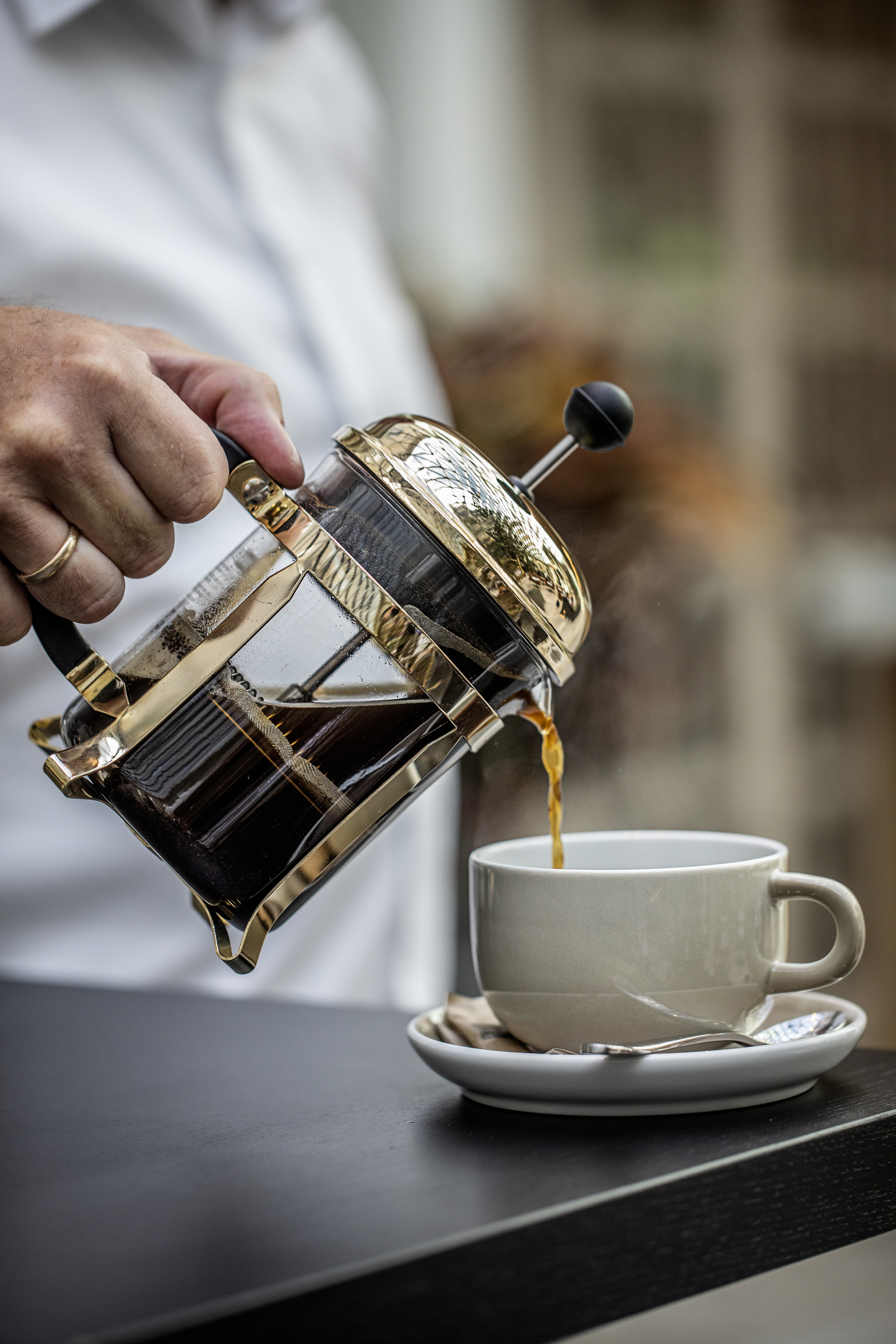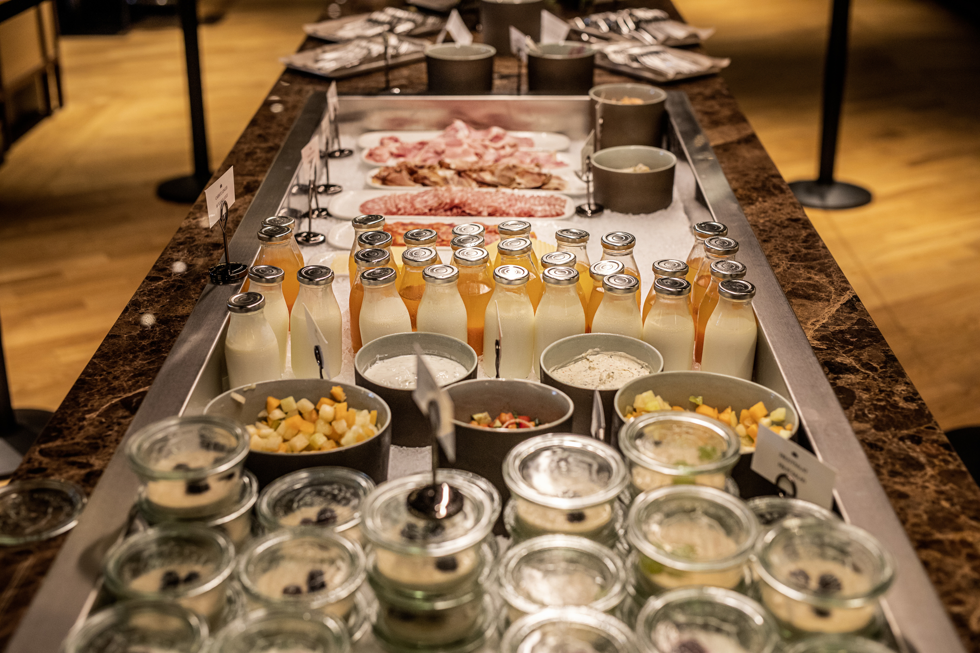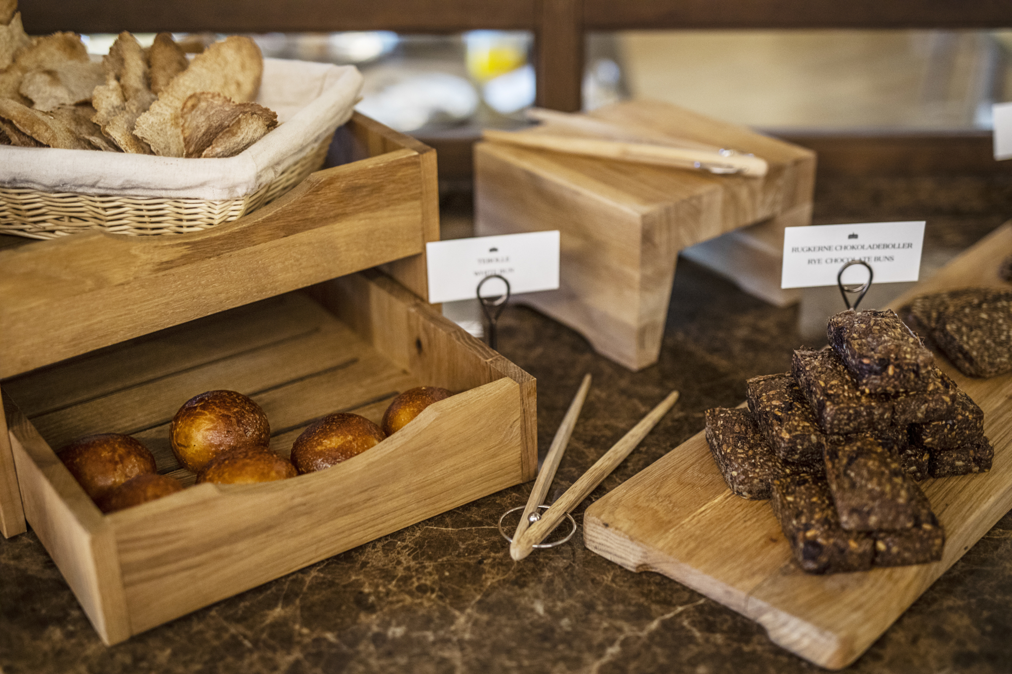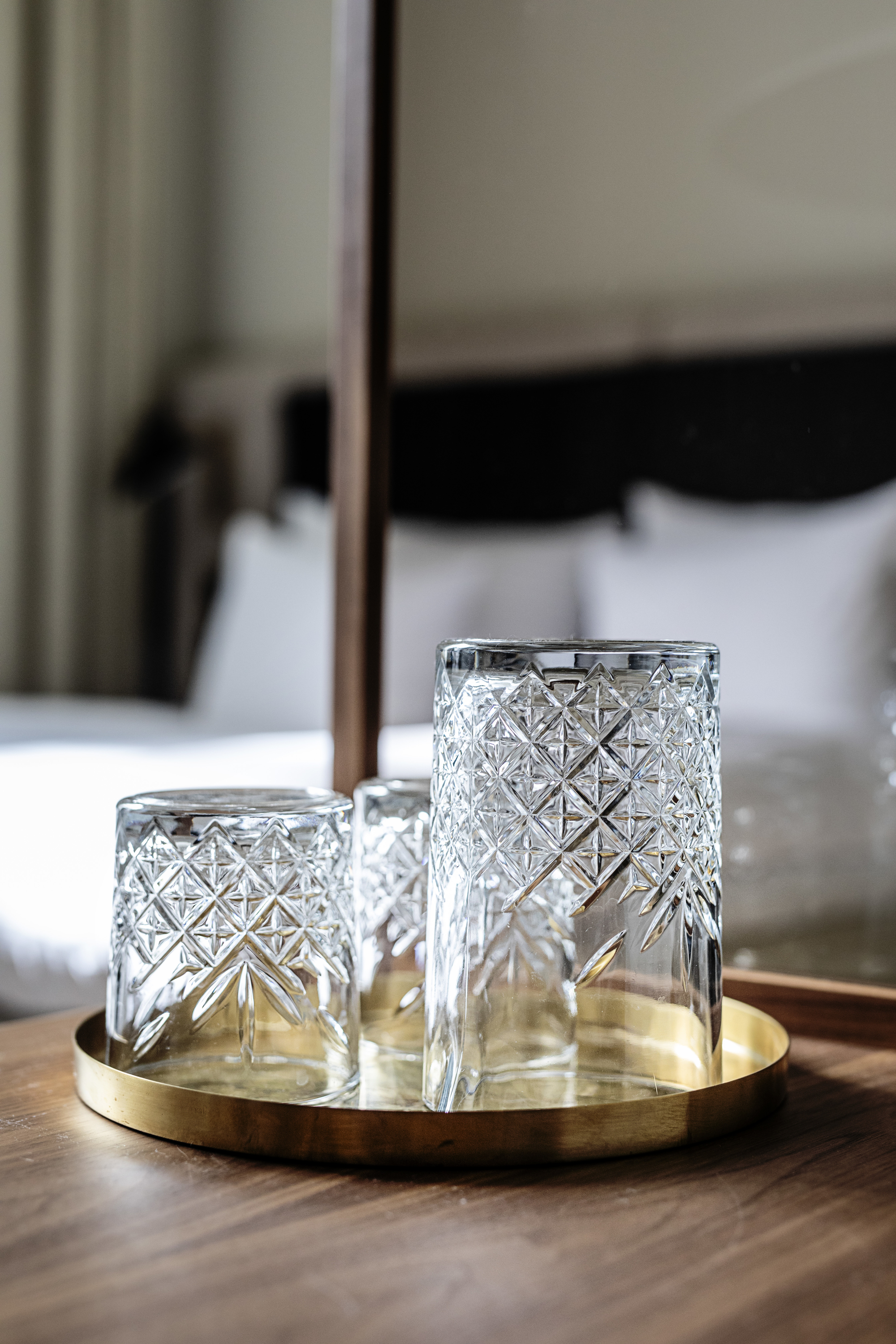 På buffeter og til den synlige opbevaring af bestik er træ et gennemgående element, og på værelserne samler specialfremstillede messingbakker de valgte Arcoroc glas.