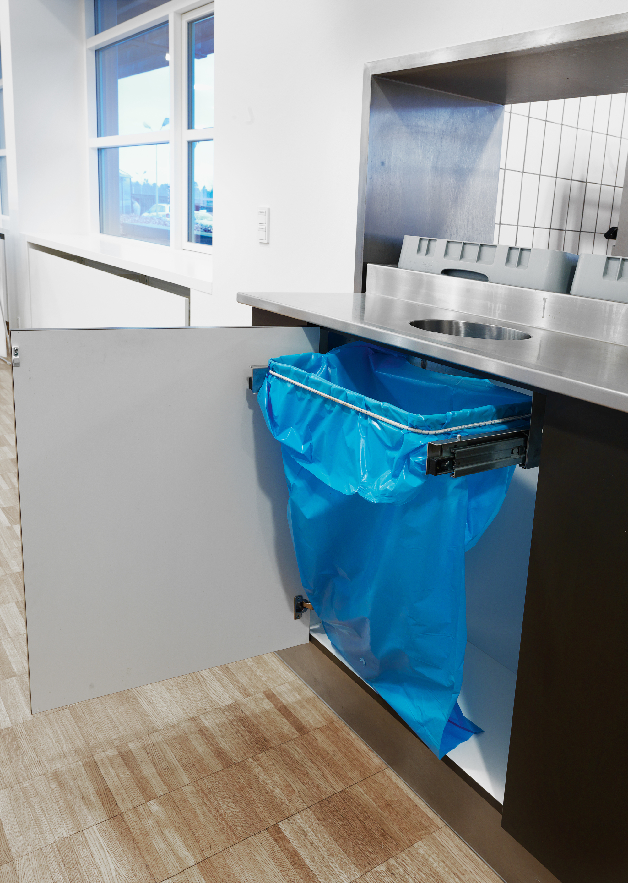 Drikkenichen i buffetområdet skærmer for afrydningen i baggrunden, hvor der er direkte åbning til opvasken. Kasseøen er med hæve-/sænkefunktion.