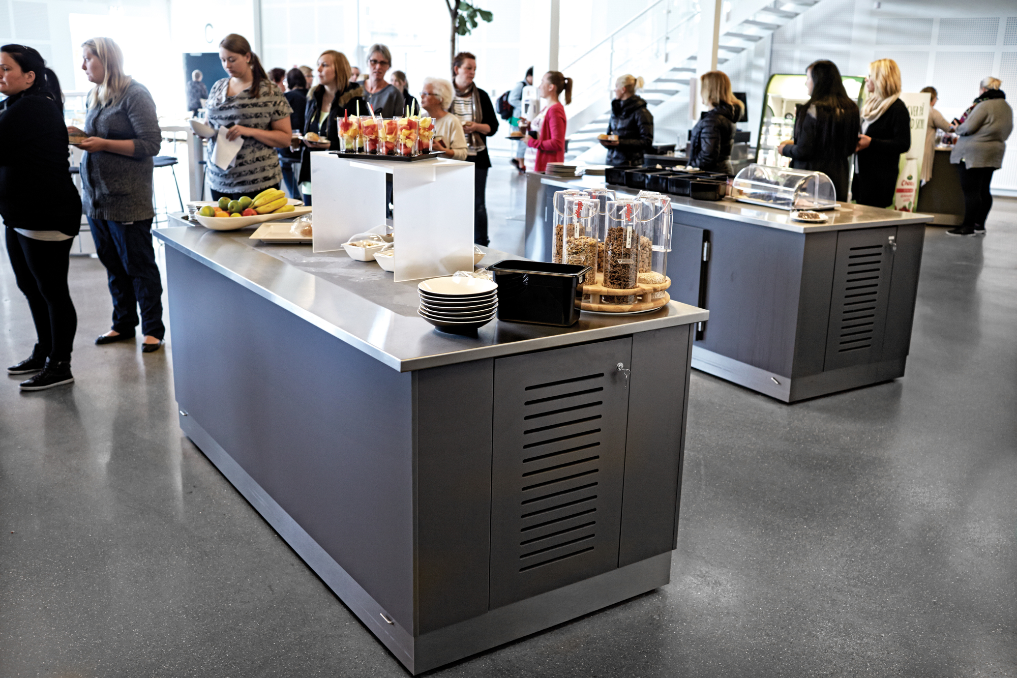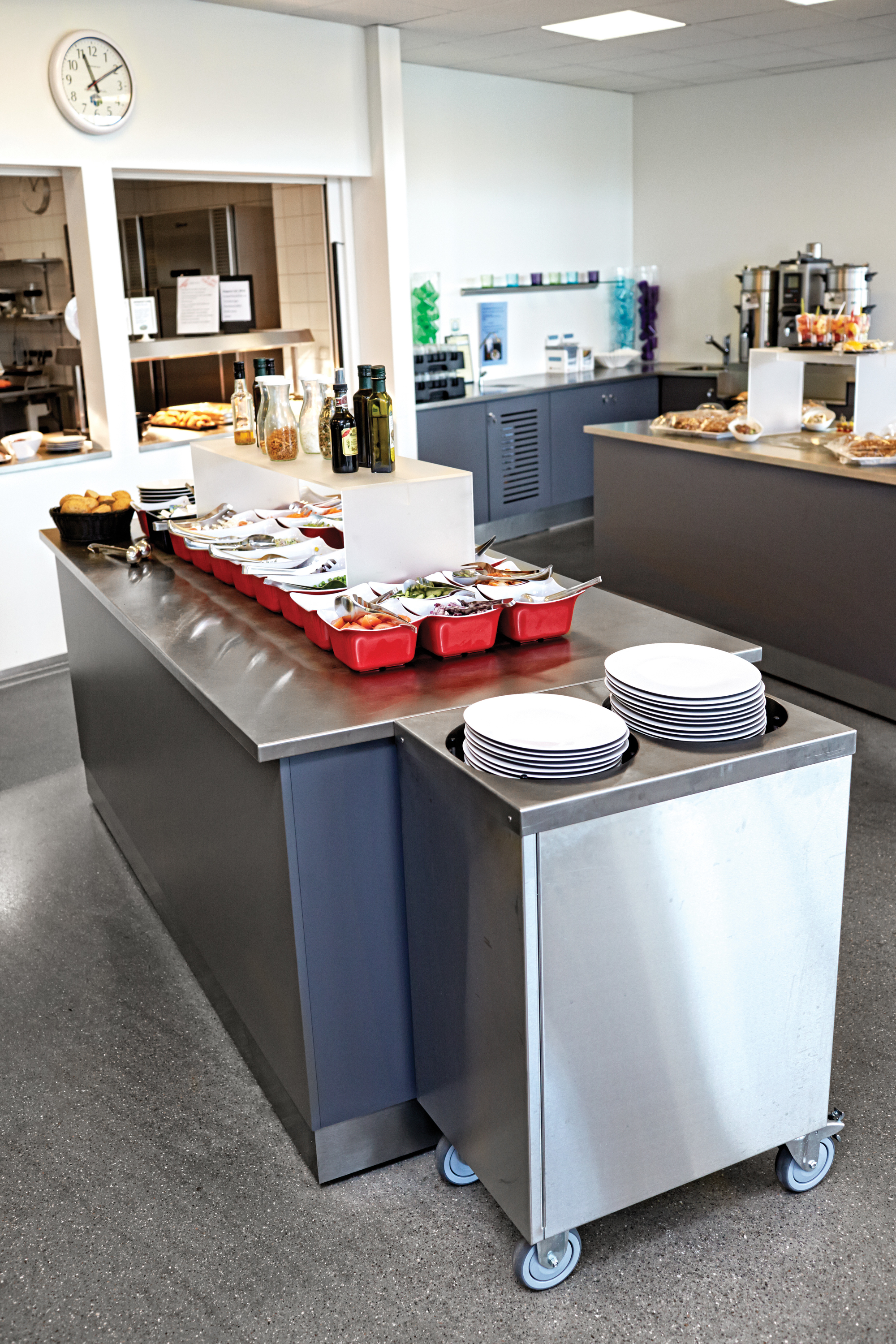 Resultatet blev, at maden fra produktionskøkkenet i den ene ende af bygningen transporteres til et anretterkøkken, der er indrettet i forbindelse med den åbne kantine, hvor skolens 500 elever kan forsyne sig fra mobile diske og afregne ved mobile kasseapparater.