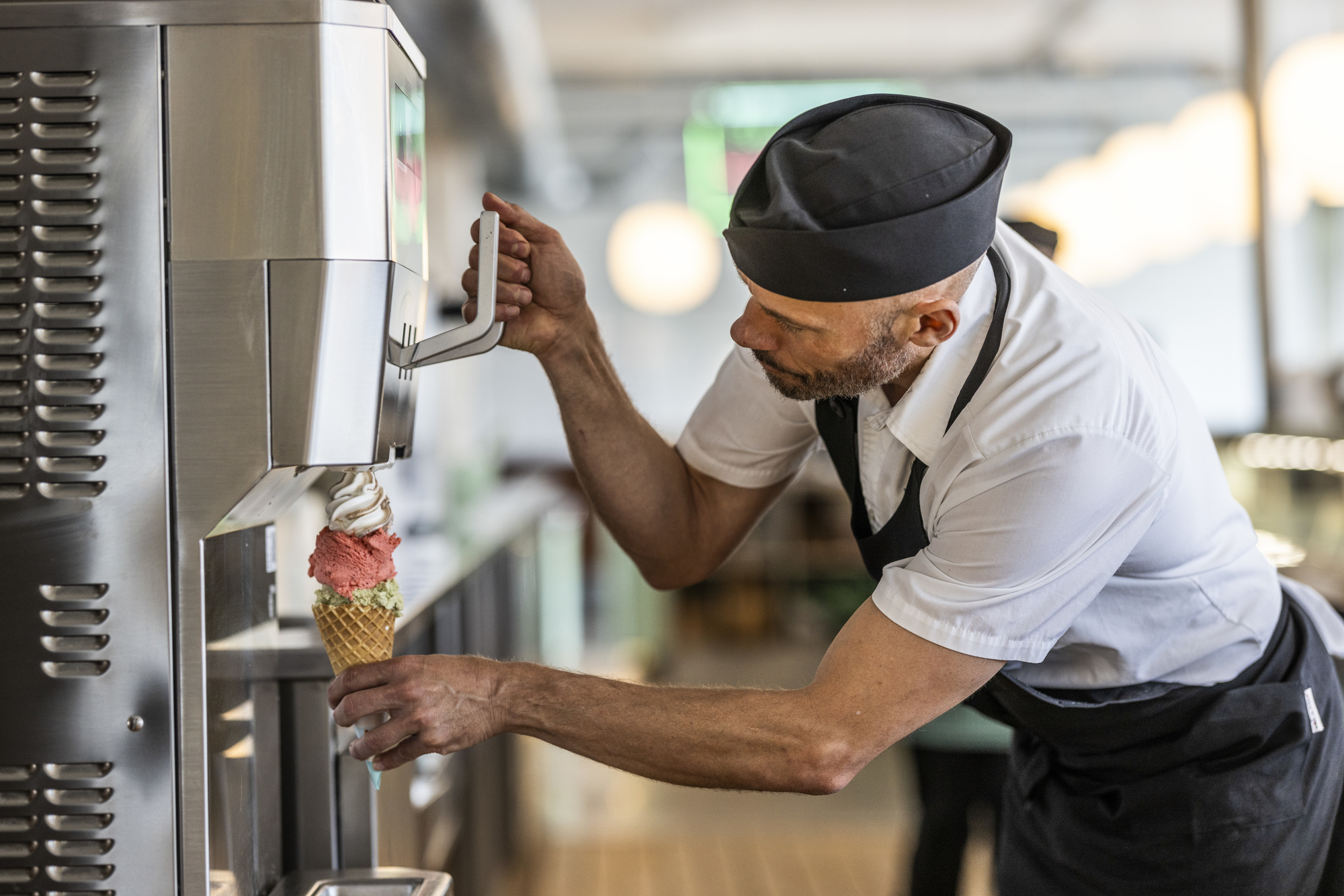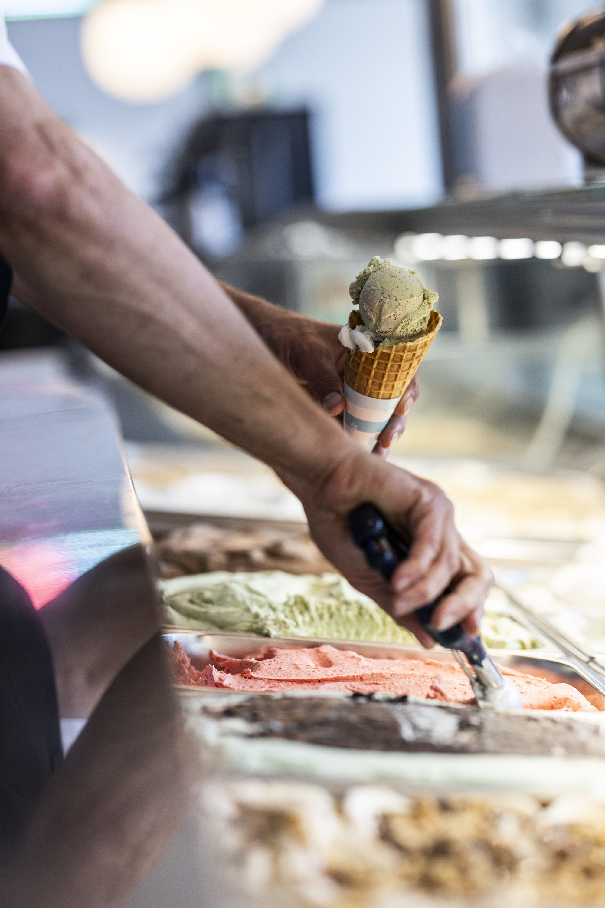 ”Idéerne til isdisken har jeg fået på mine mange rejser i udlandet – og ikke mindst fra den tur, jeg havde til Italien sammen med konsulent Frants Pedersen fra BENT BRANDT,” fortæller Kim. ”Disken skal jo både være en velfungerende arbejdsplads og et blikfang. I fronten er der plads til præsentation af 400 liter is i 40 varianter. Også en chokoladevarmer, Carpigiani softicemaskiner til Kims hje melavede softicemix, guf og drys, lyddæmpede blendere til milkshakes med kandevask indbygget i bordpladen, kaffemaskiner og kolde drikkevarer er sammen med betaling tænkt ind i et flow, hvor 9 medarbejdere ikke går i vejen for hinanden.”