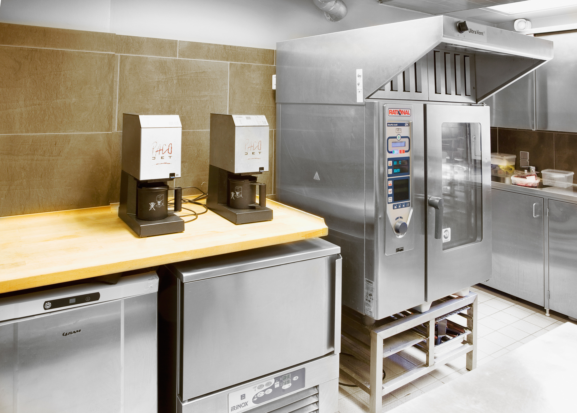 Små maskiner indbygget i et specialfremstillet stativ, som sikrer orden og sparer plads.