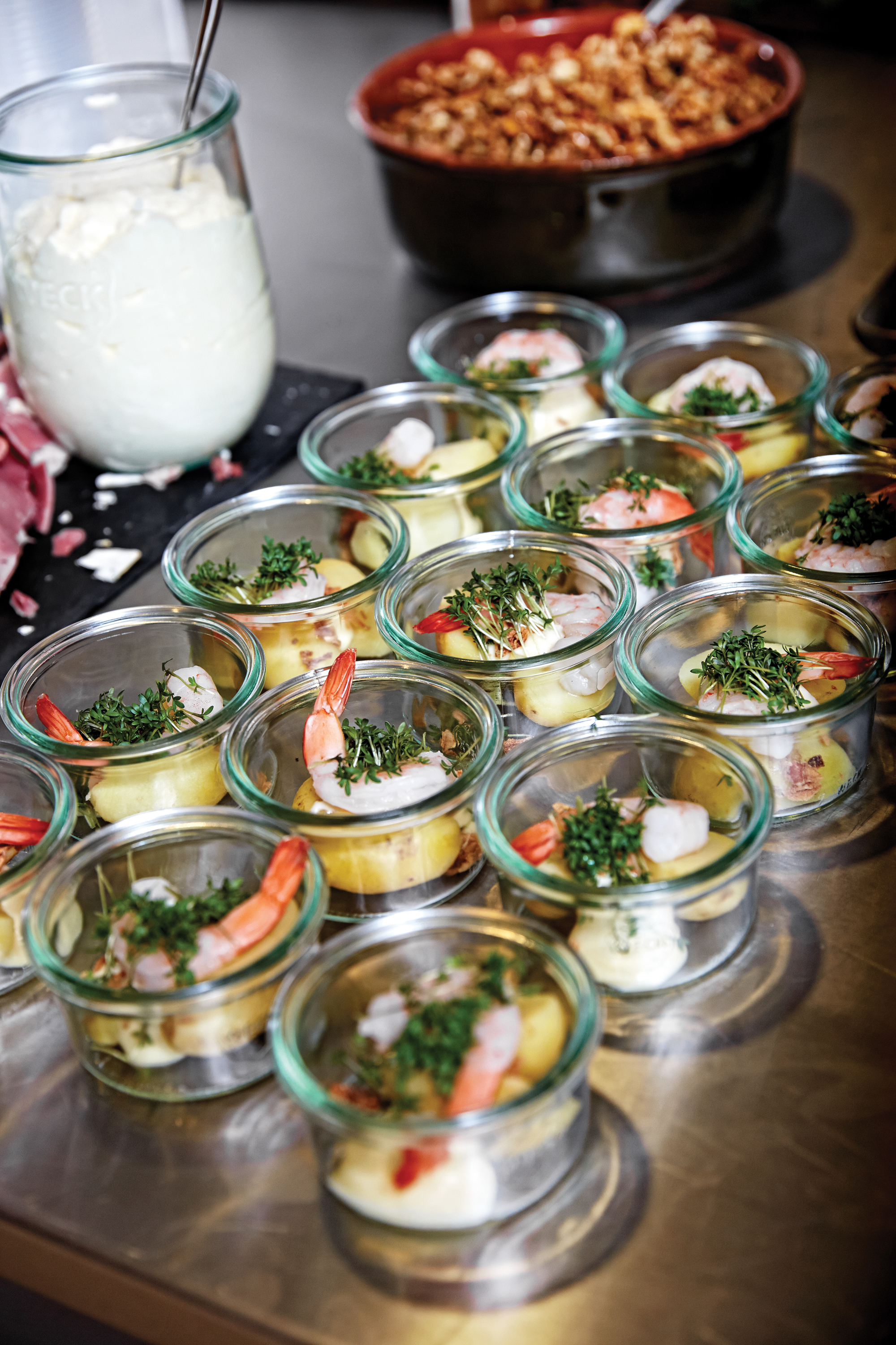 Flere af markedspladsens tilbud går igen i de gavekurve, som Erik præsenterer i det hjørne af kantinen, der er indrettet til salg ud af huset. Her kan husets medarbejdere altid finde værtinde- eller fødselsdagsgaven, der også kan omfatte noget af det BENT BRANDT isenkram, som man finder på buffeten – skæreplanker, flotte fade og skåle, viskestykker og engangsservice fra SP1S-sortimentet til bordet derhjemme eller picnicen derude. Kurvene laves også på bestilling. Olier, eddiker, marmelader…