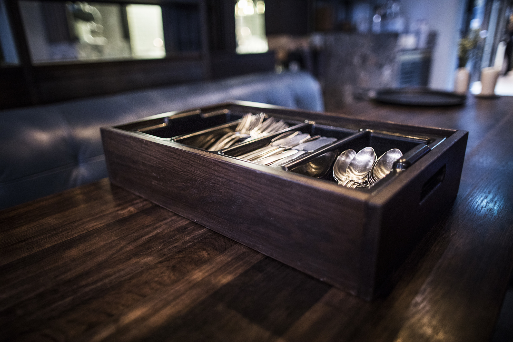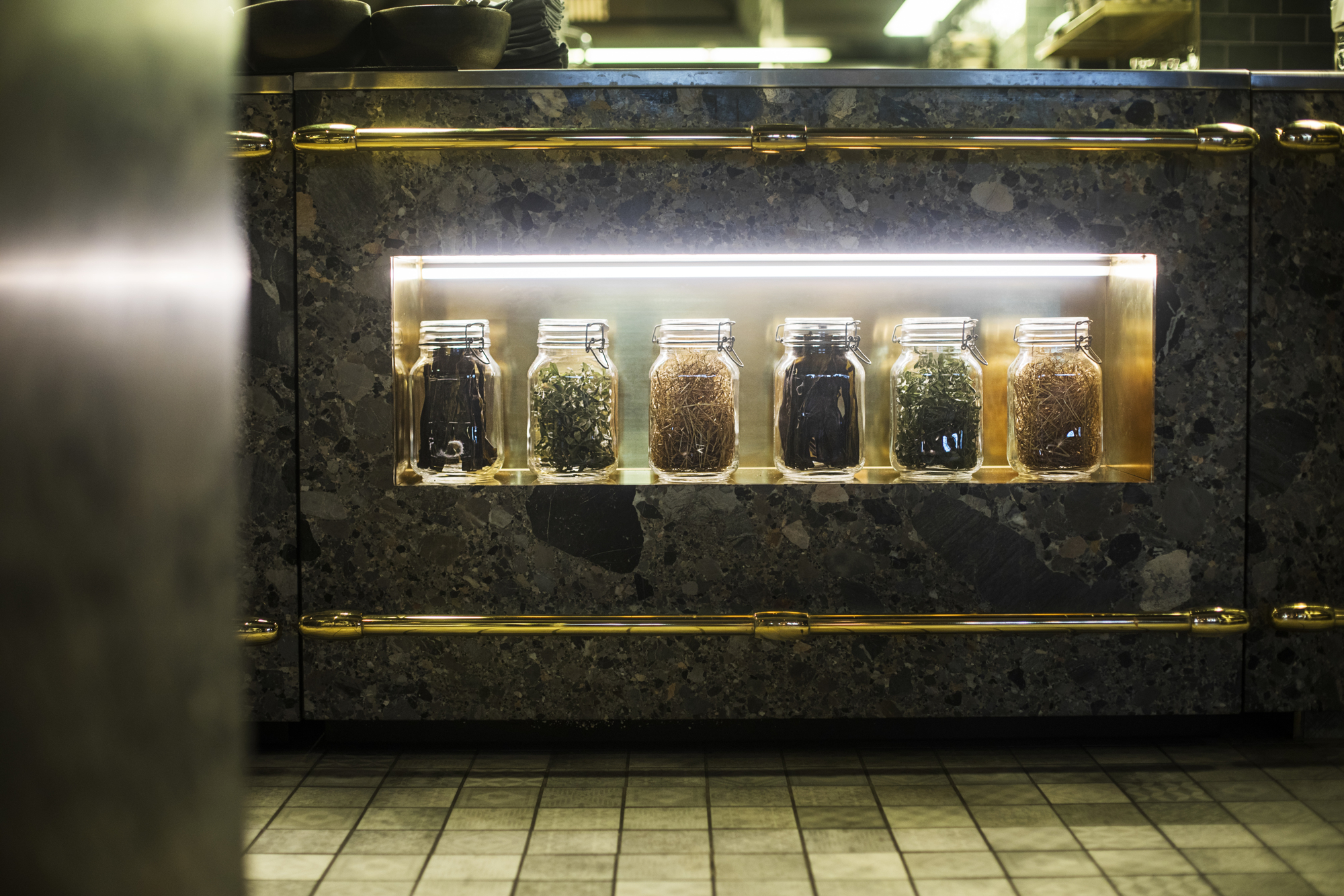 Will var helt afklaret med, at kravene til morgenmadsbuffeten ikke måtte efterlade et indtryk af en buffetrestaurant. Men hvad nu hvis man anretter morgenbuffeten i det åbne køkken? Hvis gæsterne selv går ud til kokken ved det imponerende franske Molteni-komfur for at få sine lune retter og en snak? Hvis man på vejen forsyner sig fra begge sider af to diske, der er kørt i stilling i forlængelse af komfuret, som efterfølgende vendes 90 grader og bliver til udleveringsdiske til service. Diske, der er bygget med familieskab til Molteni-komfurets messing, skabt i grå granit fra Italien og færdig-bearbejdet af Søren Vesters faste stenhuggeri på Fyn?