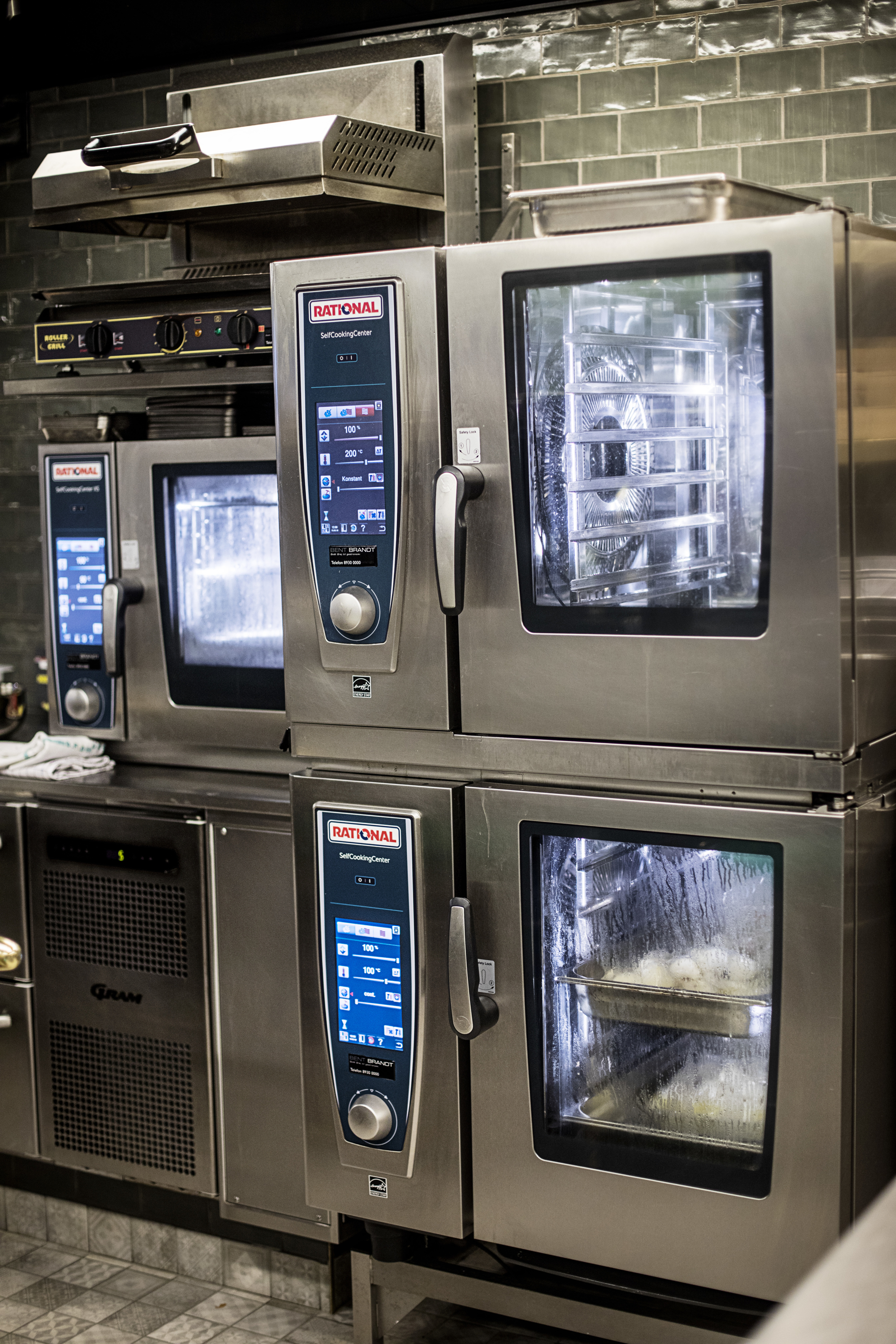 Begynder der at tegne sig et billede af et køkken, hvor hver en detalje er gennemtænkt, og alle materialer er i særklasse? Et køkken, hvor de flotteste grønne fliser på væggene og gyldne klinker på gulvet matcher både messing og rustfrit stål på borde, maskiner og i hele loftet, der er ét stort emfang. Et køkken, der er nemt at holde rent, hvilket også gælder i 'det gamle' køkken, der nu er bageri med ergonomiske hæve-/sænkeborde. Et køkken, hvor hver en niche eller krog er udnyttet, og alt står snorlige på sin plads.