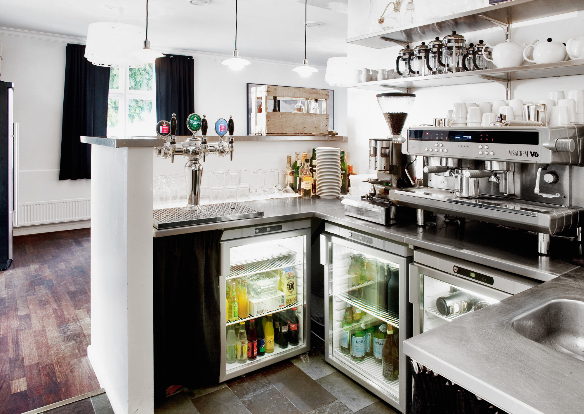 Den kombinerede bar/tjenerstation er centralt placeret i restauranten med køleskabe til drikkevarer, fadølsanker, kaffekværn, espressomaskine, isterningmaskine, glas mv.